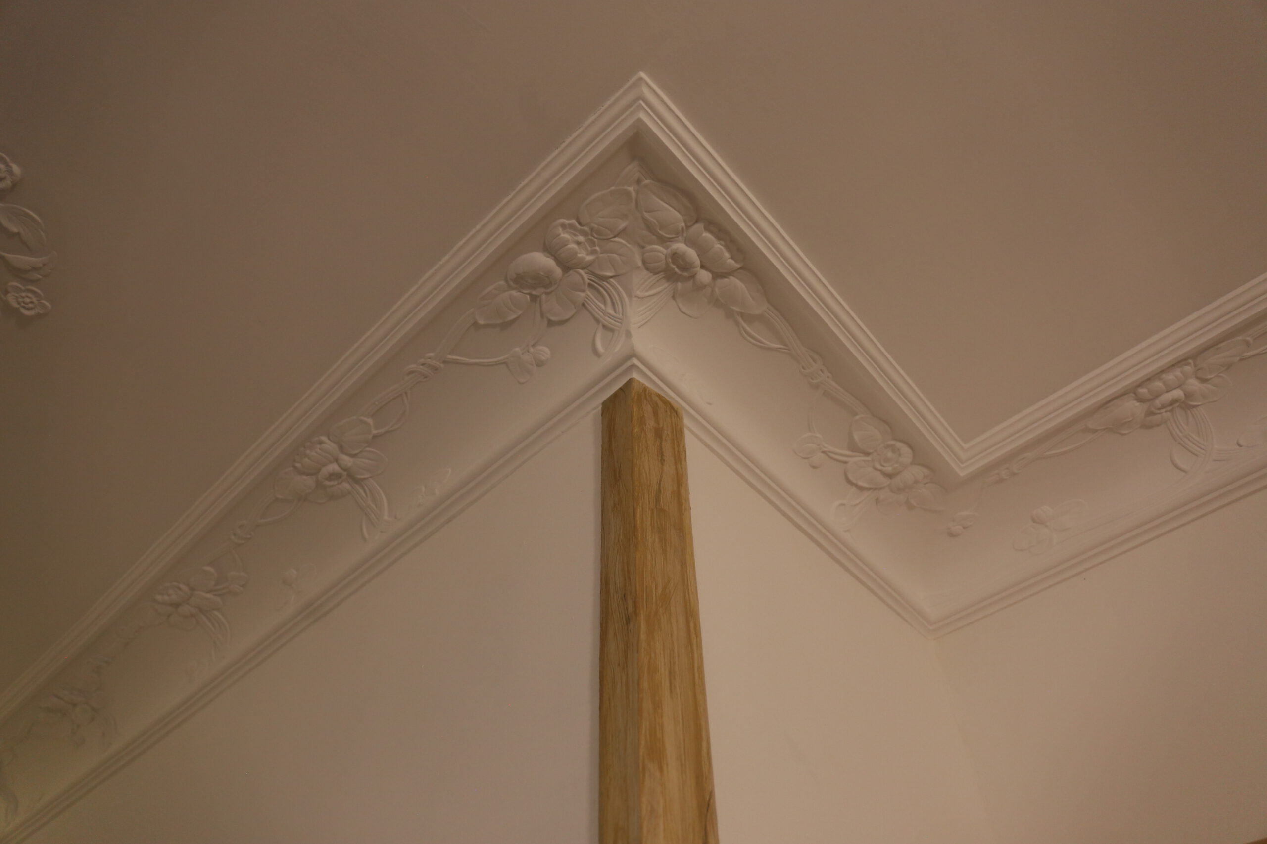 Eine schlicht profilierte Hohlkehle mit weichen, fließenden Linien, die einen harmonischen Übergang zwischen Wand und Decke schafft. Sie verleiht dem Raum eine ruhige., kultivierte Atmosphäre und fügt sich sowohl in historische als auch moderne Interieurs ein, wo sie einen dezenten, stilvollen Akzent setzt.