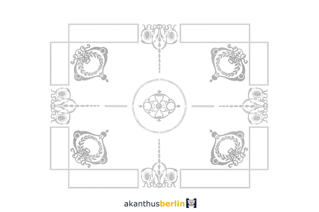 Im Deckenspiegel der Stuckdecke DS 20 Variante 1 ist das DB60-2 gebogen, für einen Kranz und gerade, für eine Art Verlängerung, integriert worden.