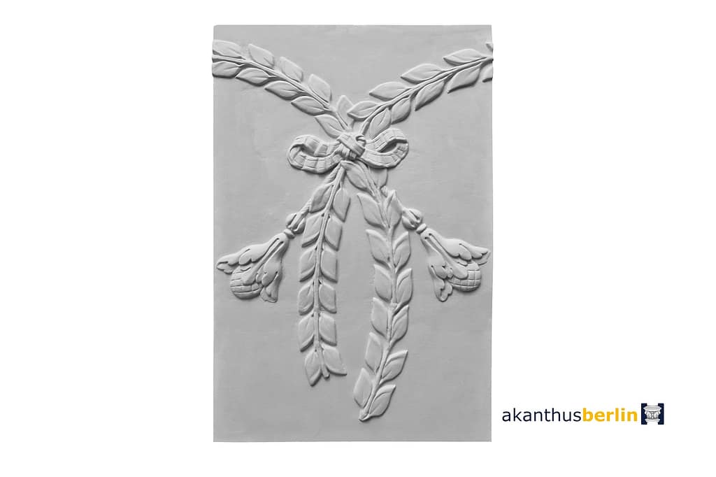 Somit lässt sich ein flacher und schlichter Lorbeerkranz, in die Deckenmitte bringen.