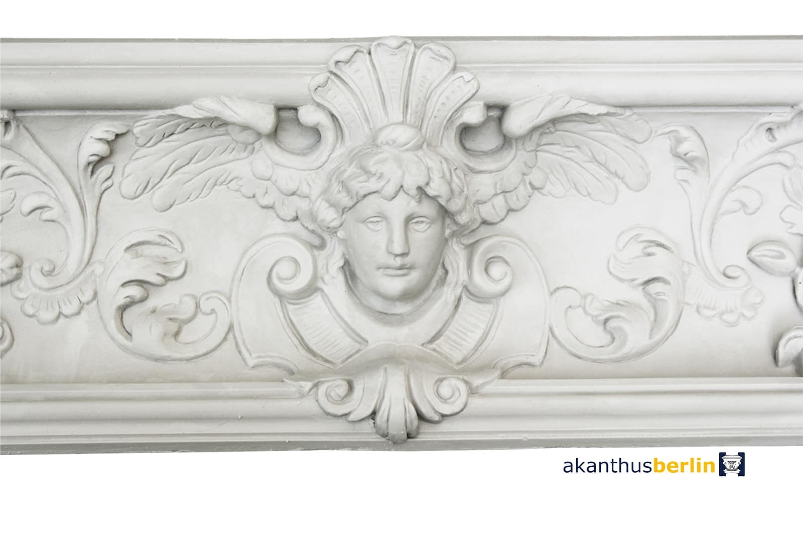 Das Eckgesims EC 05 ist aus der Berliner Gründerzeit, welches mit einem Puttenkopf und Rocaillen umschlungenen Rosenköpfen verziert ist.