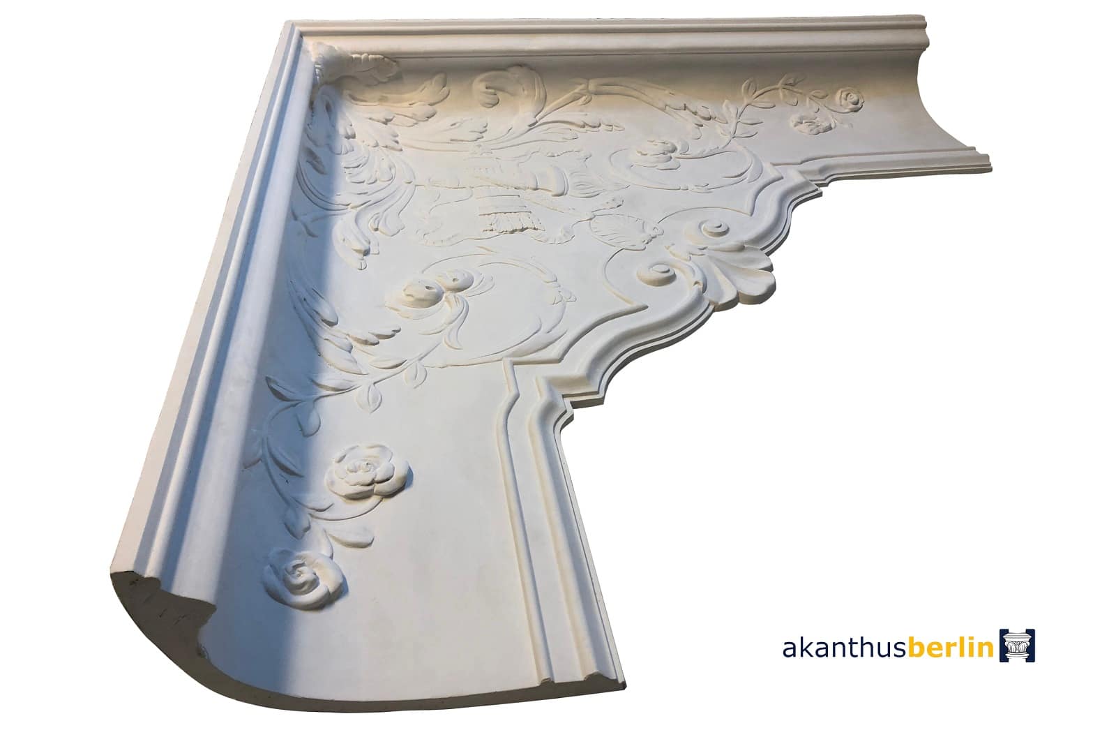 Die ornamentierte Ecke EC 10 ist das Verbindungselement zur glatten profilierten Hohlkehle EC 79.
