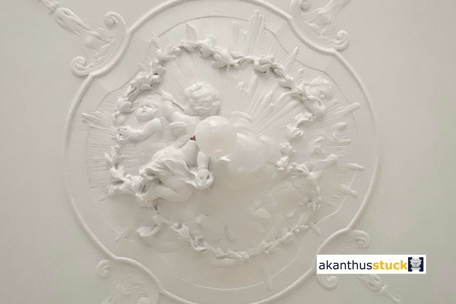 Ein Stuckelement lässt sich problemlos mit allen Farben streichen. Achten Sie darauf, dass die Farbe etwas verdünnt und nur leicht aufgetragen wird, da ansonsten die filigranen Konturen nach mehrmaligem Streichen verloren gehen.