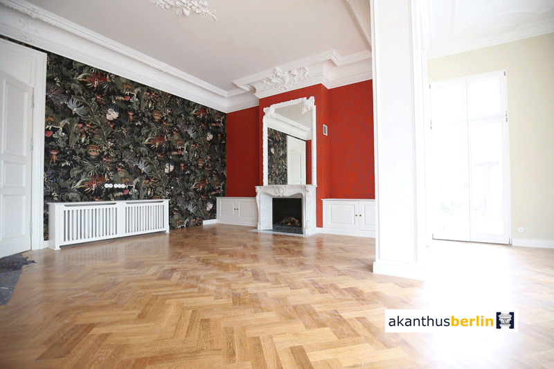 Am Kurfürstendamm montierten wir einen wand-/ flächen-/ putzbündigen Wandspiegel zusammen mit den kosossalen Stuckelementen der Stuckdecke DS 18.